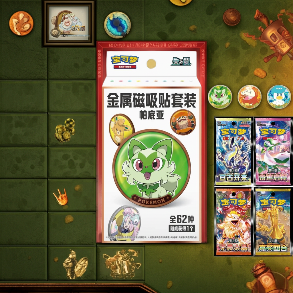 Pokémon TCG Paldea Collection Box (Simplified Chinese Edition) – Includes 2 sealed booster packs, a collectible metal magnet badge, and features a rare Simplified Chinese design, making it a gift-ready, must-have collectible for Pokémon fans and TCG players of all ages.